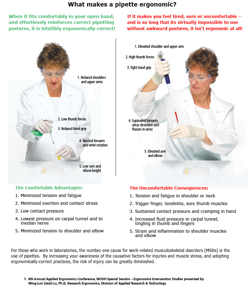 為了“符合人體工程學的正確”,傳統移液姿勢的重大變化是必不可少的 - 例如**小化前臂和手腕旋轉,保持低臂和肘部高度,以及放松肩膀和上臂。當使用具有細長軸向設計的移液器時,這幾乎是不可能的。